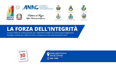 “La forza dell’integrità. Eticà e trasparenza nelle amministrazioni locali”. Martedì 30 settembre evento a Foggia