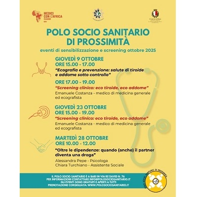 Gli appuntamenti sono promossi dal Polo Socio Sanitario di Prossimità di Bari e organizzati da Psicologi per i Popoli Bari e Bat e Medici con l’Africa Cuamm Bari, in collaborazione con l’assessorato comunale al Welfare.