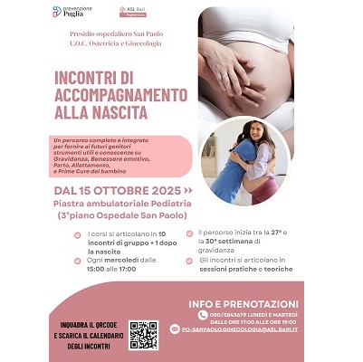 Bari, 4 ottobre 2025 – L’unità operativa complessa di Ostetricia e Ginecologia dell’ospedale San Paolo ha riattivato i corsi pre parto dedicati alle coppie in attesa di un figlio. Dal prossimo 15 ottobre fino al 14 gennaio prendono il via undici incontri (10 più 1 dopo la nascita) di accompagnamento alla nascita a cura di un team multidisciplinare composto da diverse figure professionali: ostetrica, psicologa, infermiera, ginecologo, neonatologa, anestesista, dietista, assistente sociale. Il programma mira a fornire strumenti utili e conoscenze su gravidanza, benessere emotivo, parto, allattamento e prime cure del bambino.