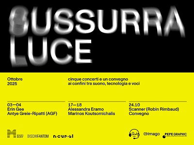 Dalle risonanze emozionali di Erin Gee (3 ottobre, ingresso libero) alle trame sonore femministe di AGF (4 ottobre, ingresso libero); dalle esplorazioni vocali di Alessandra Eramo (17 ottobre) alle indagini multimediali di Marinos Koutsomichalis (18 ottobre), fino al grande finale con il pioniere britannico Scanner/Robin Rimbaud (24 ottobre) preceduto da un convegno dedicato.