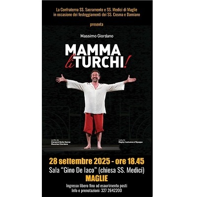 Massimo Giordano in scena domani, domenica 28 settembre (alle 18.45), a Maglie, presso la sala “Gino De Iaco” annessa alla Chiesa dei Santi Medici, con “Mamma li Turchi!”. Spettacolo – scritto a quattro mani con il giornalista Giovanni Delle Donne – che dal 2020 gira la Puglia, e non solo, per raccontare una storia eccezionale: quella degli ottocento Martiri di Otranto.
