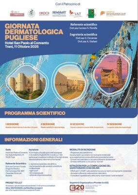 La dermatologia non è soltanto una branca della medicina dedicata alla cura della pelle, ma un punto d’incontro tra discipline diverse, dall’infettivologia all’allergologia, dalla reumatologia all’oncologia, fino alla fotobiologia e alla medicina interna. È da questa consapevolezza che nasce la Giornata Dermatologica Pugliese, in programma sabato 11 ottobre all’Hotel San Paolo al Convento di Trani, sotto la direzione scientifica della dottoressa Carmen Silvia Fiorella, responsabile dell’Ambulatorio di Dermatologia dell’ospedale “Dimiccoli” di Barletta, con la collaborazione della segreteria scientifica composta dalle dottoresse Giulia Ciccarese e Angela Giuliani.