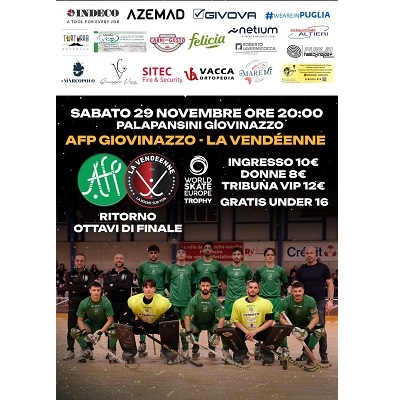 Giovinazzo torna ad ospitare una gara europea di hockey su pista dopo 10 anni. Sabato 29 novembre 2025 l’Afp ospiterà la squadra francese La Vendéenne La Roche-Sur-Yon per la gara di ritorno degli ottavi di finale di WSE Trophy Cup.